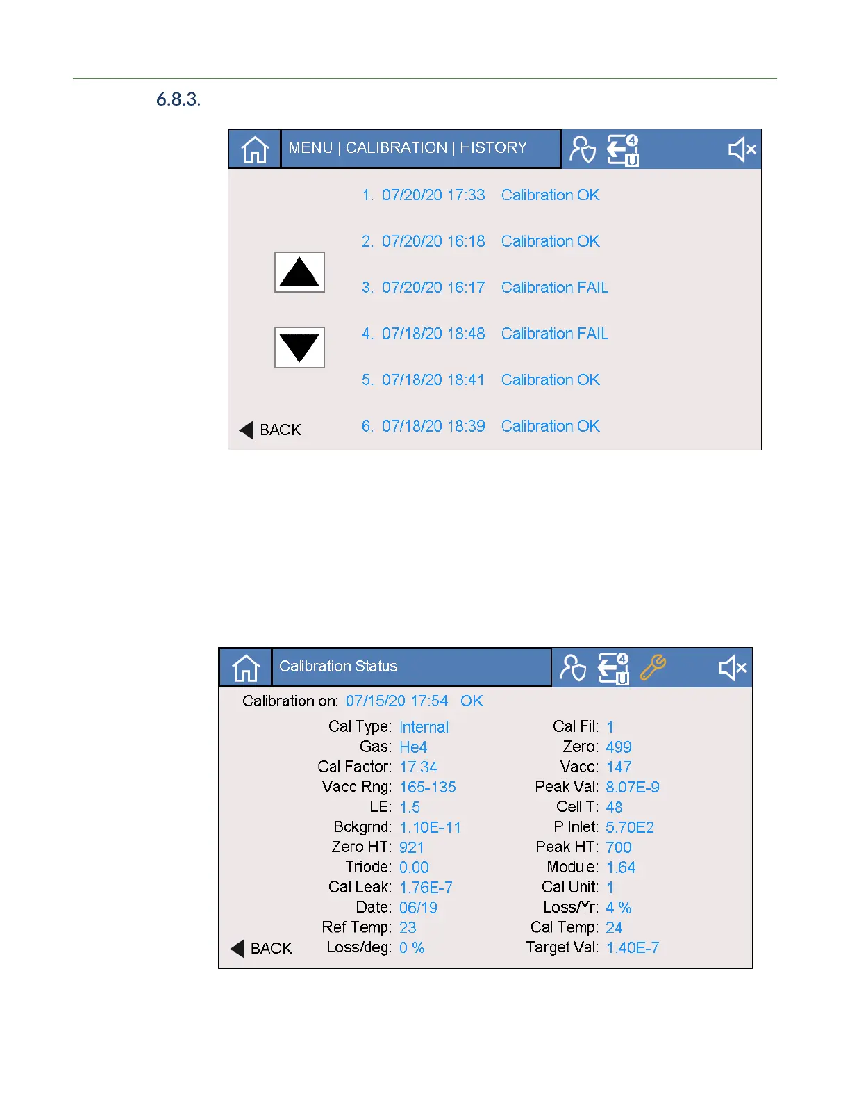 The Calibration History screen provides a review of the last 20 calibrations or cal
