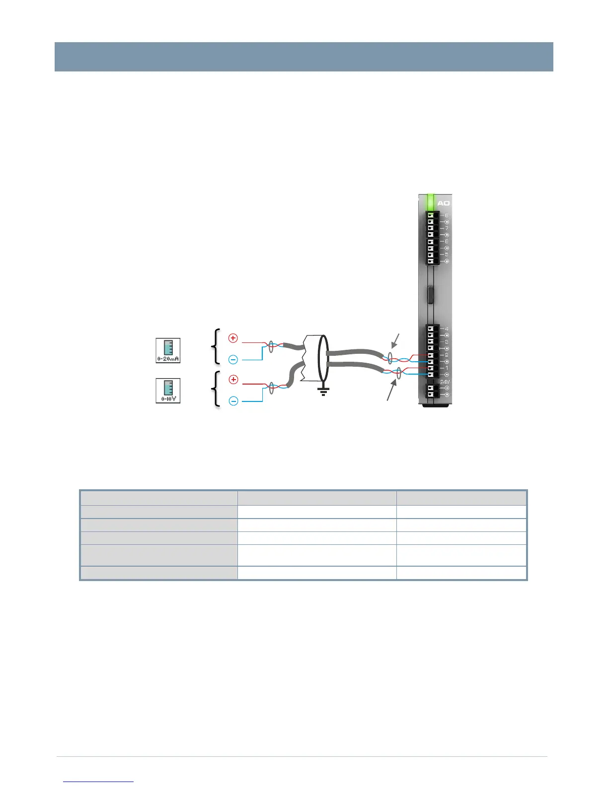 Each AO can be configured in voltage or current (parameter handled by the software).