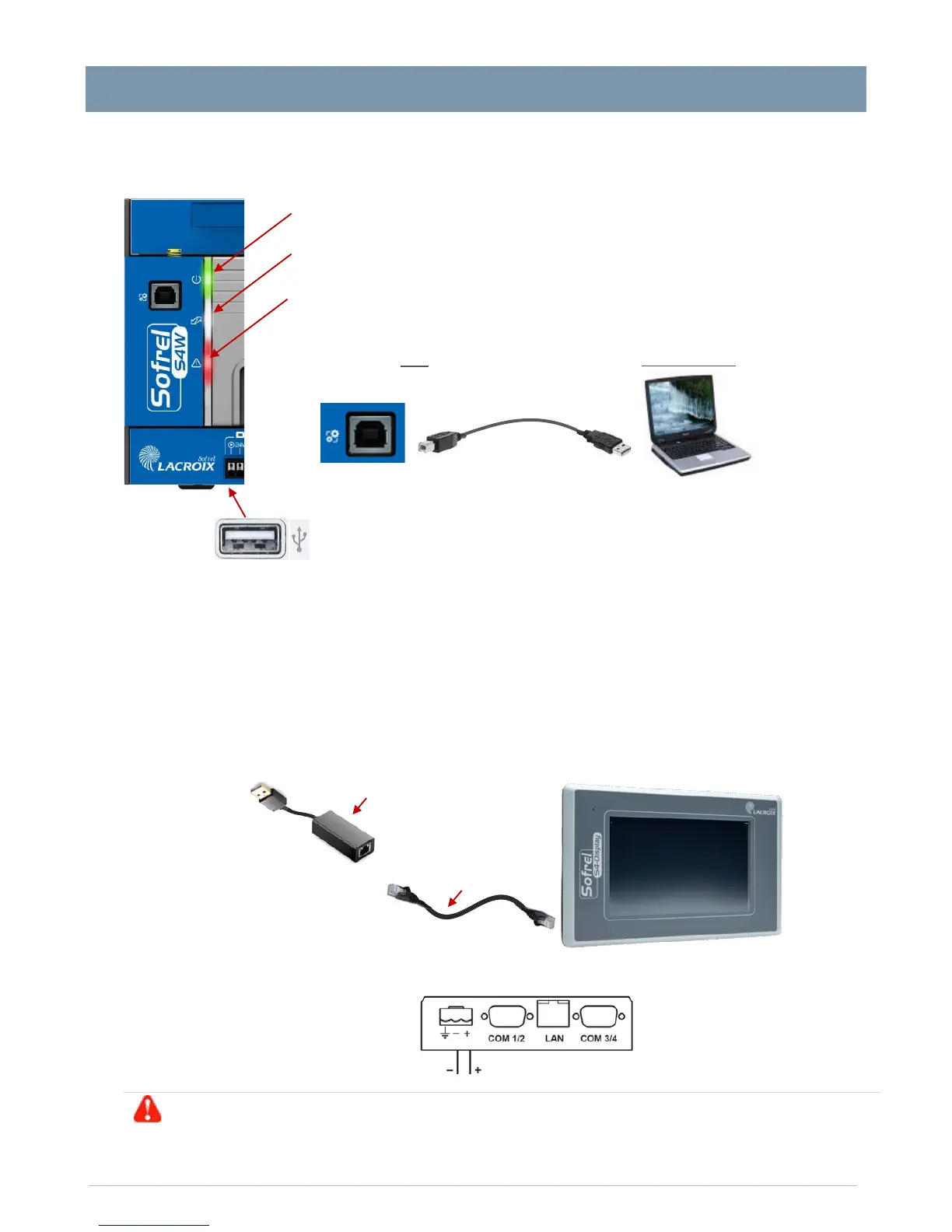 -face, the USB port, type B (printer), connects to the configuration PC.
