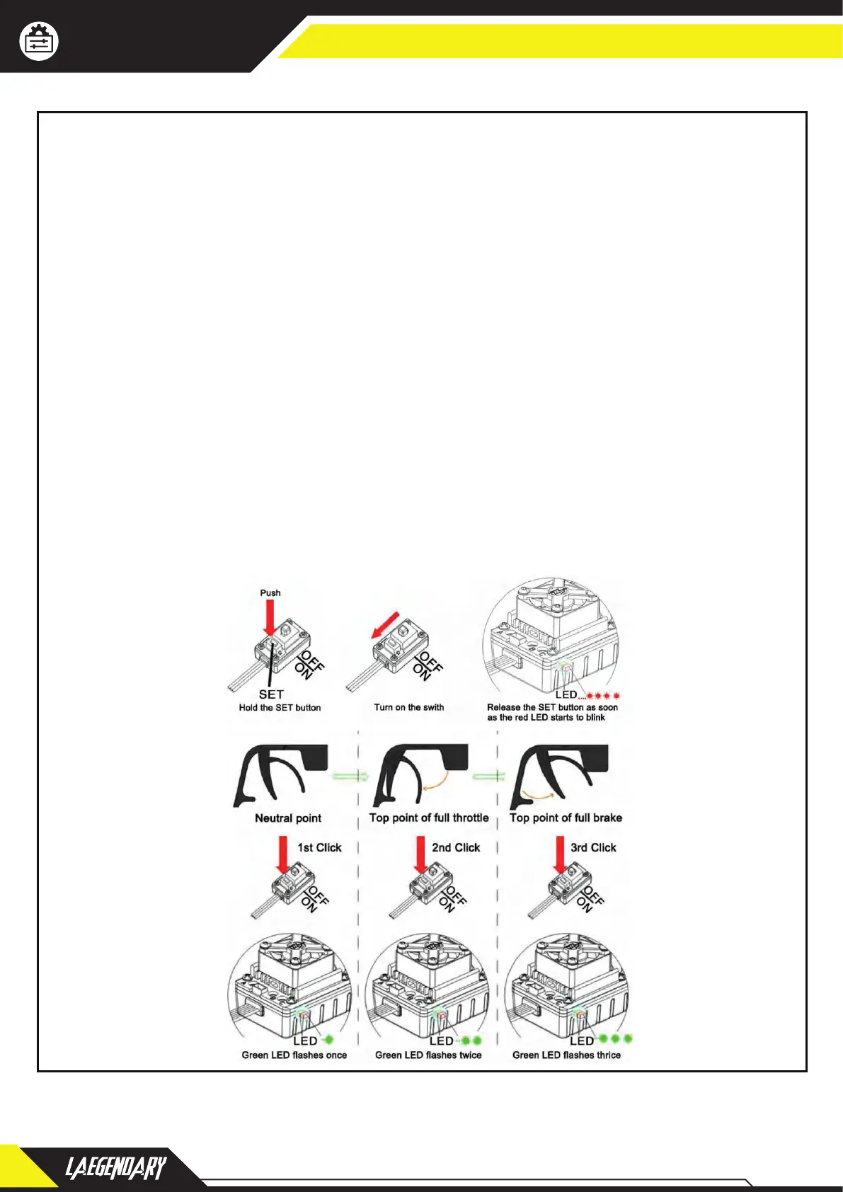 Note2: If you don’t release the “SET” key after the red LED begins to flash, the ESC will