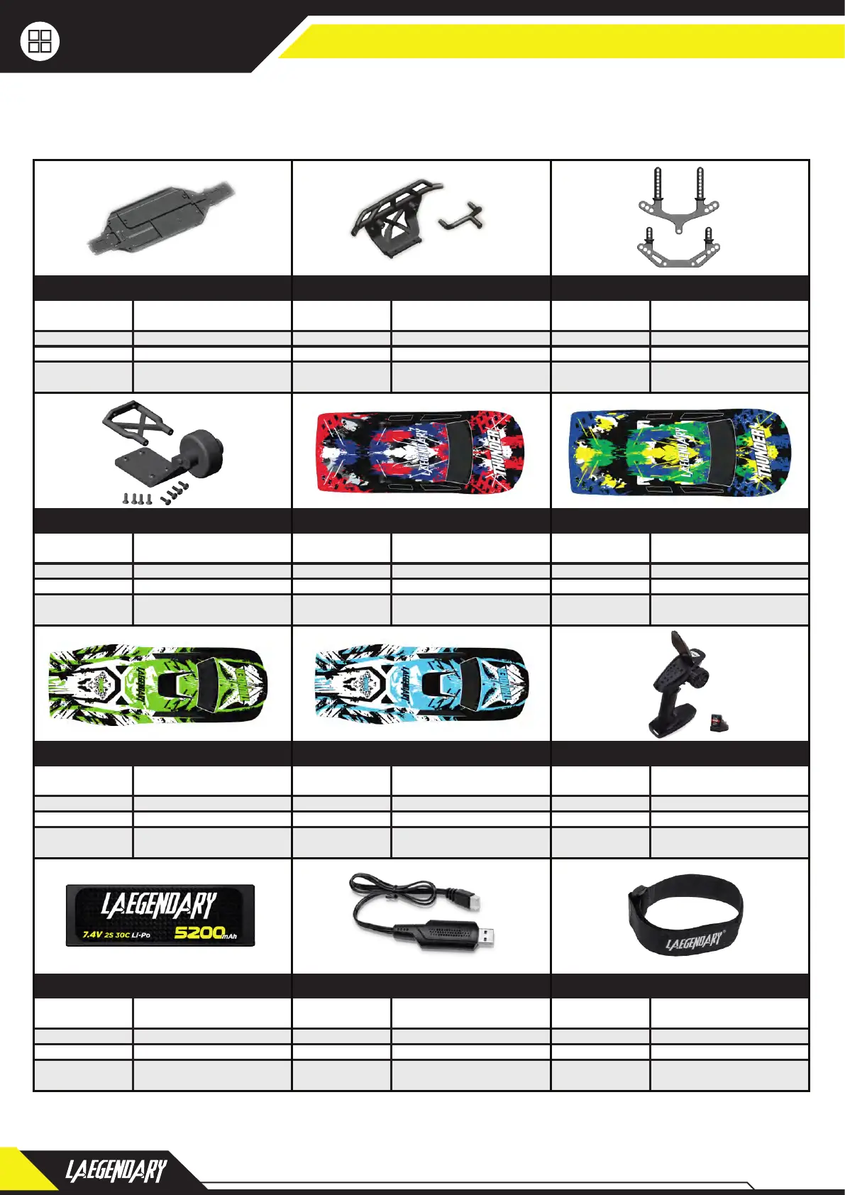 LAEGENDARY THUNDER - Replacement Parts - Electronics and Bodies; Chassis Plates, Bodies, and Wheelie Bars; Battery, Charger, and Remote System