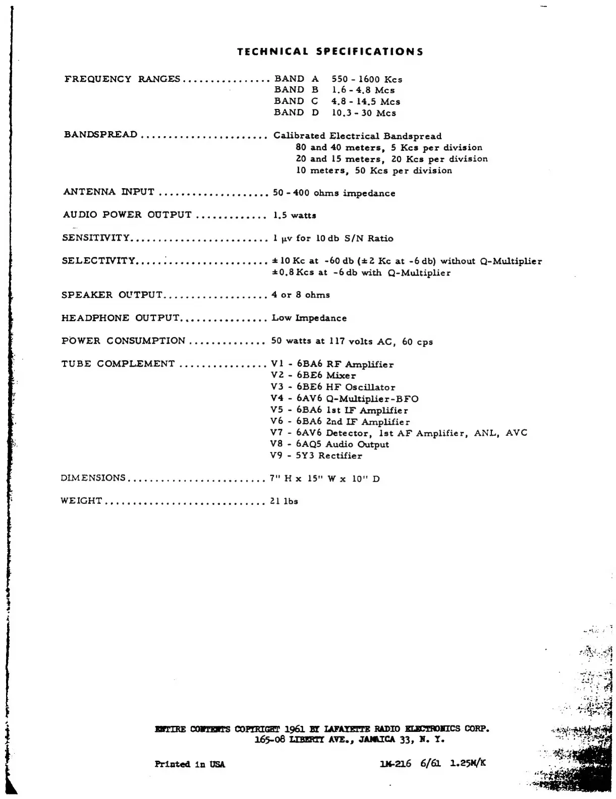 Lafayette HE-30 - Technical Specifications; Performance Specifications