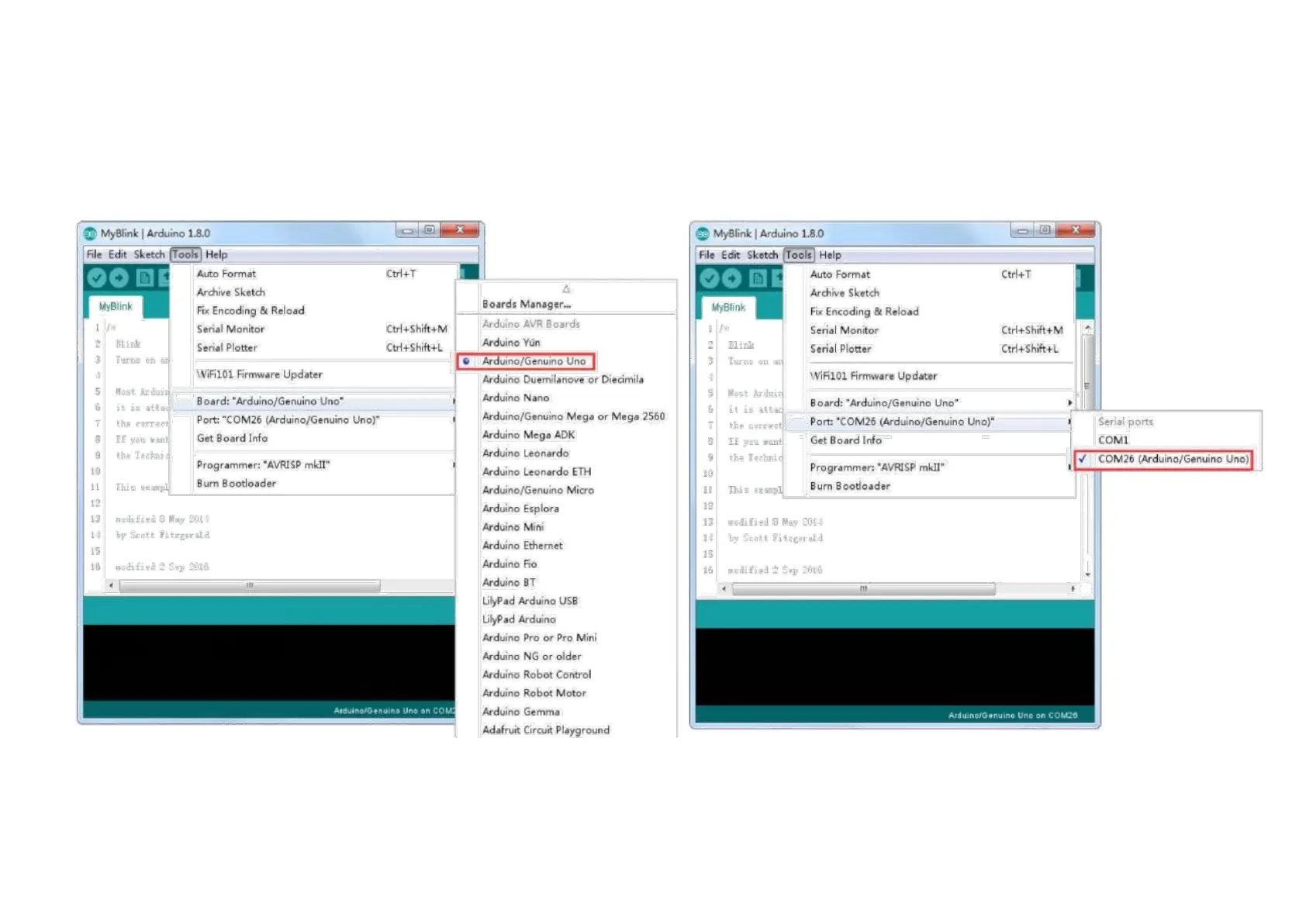 'Board Type' and 'Serial Port' are set correctly.