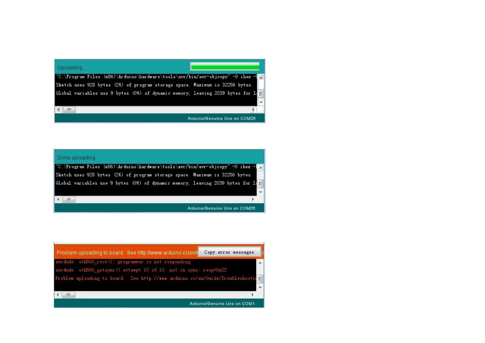 Next, the status will change to 'Uploading'. At this point, the LEDs on the Arduino should start to flicker as the sketch is transferred.
