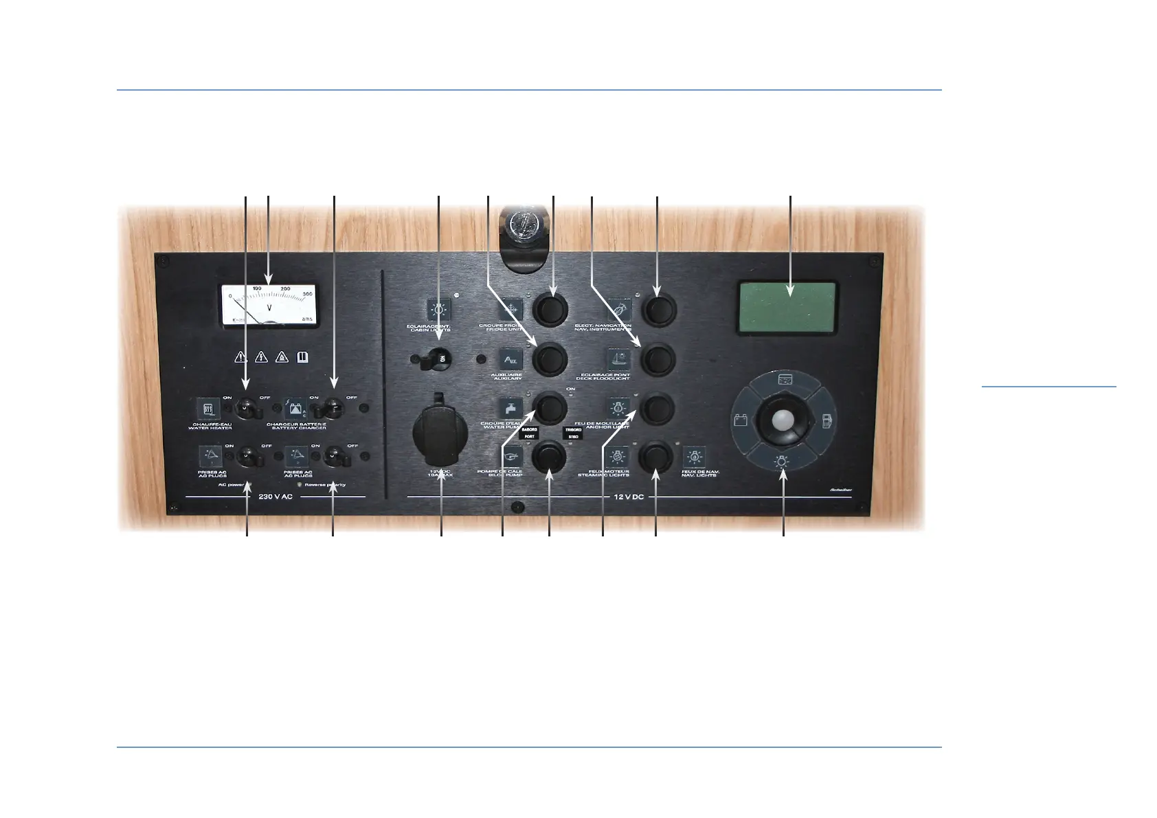 voltmeter, ammeter, battery alarm).