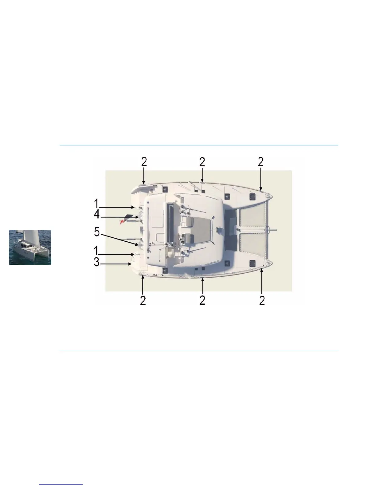1 - Midship cleat for towing. 3 - Swimming ladder.
