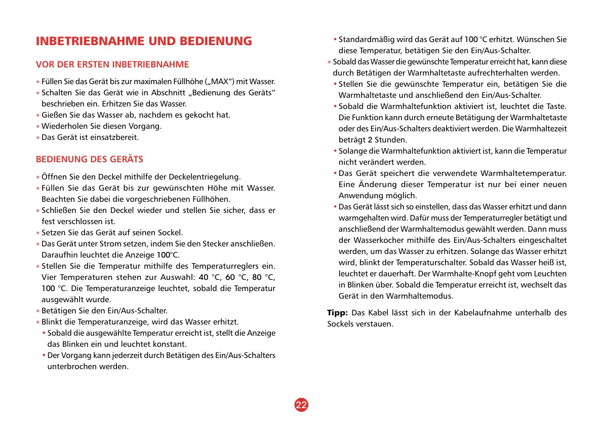 Das Gerät lässt sich so einstellen, dass das Wasser erhitzt und dann