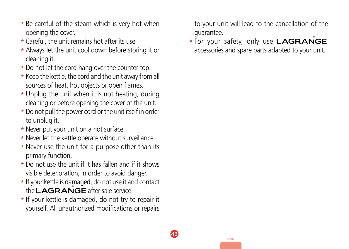 Keep the kettle, the cord and the unit away from all