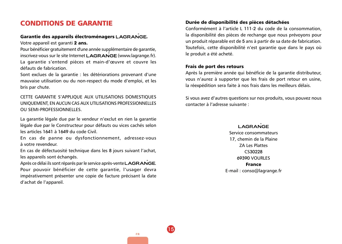 CETTE GARANTIE S’APPLIQUE AUX UTILISATIONS DOMESTIQUES