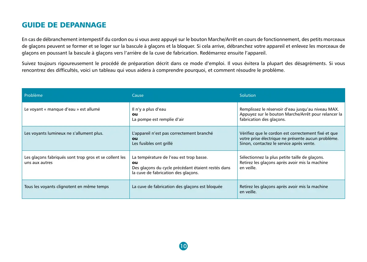 Tous les voyants clignotent en même temps La cuve de fabrication des glaçons est bloquée Retirez les glaçons après avoir mis la machine