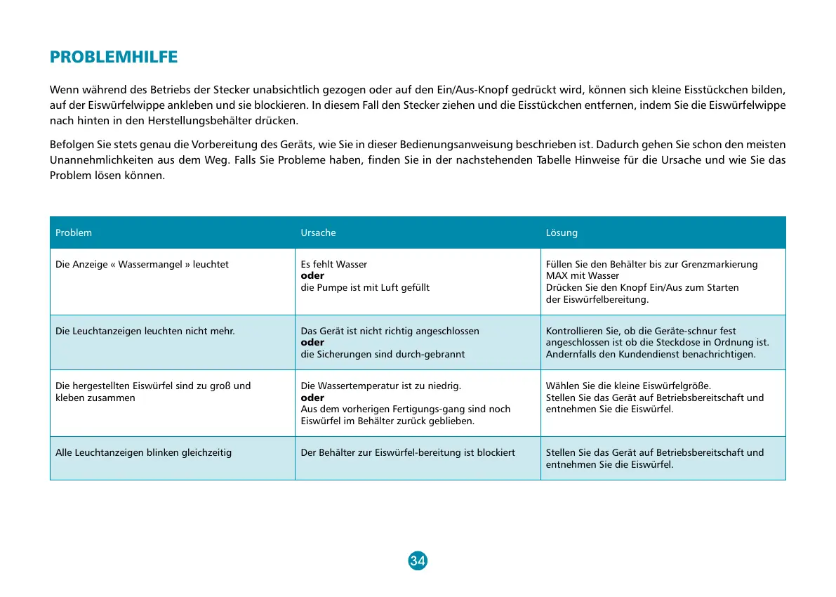 Alle Leuchtanzeigen blinken gleichzeitig Der Behälter zur Eiswürfel-bereitung ist blockiert Stellen Sie das Gerät auf Betriebsbereitschaft und