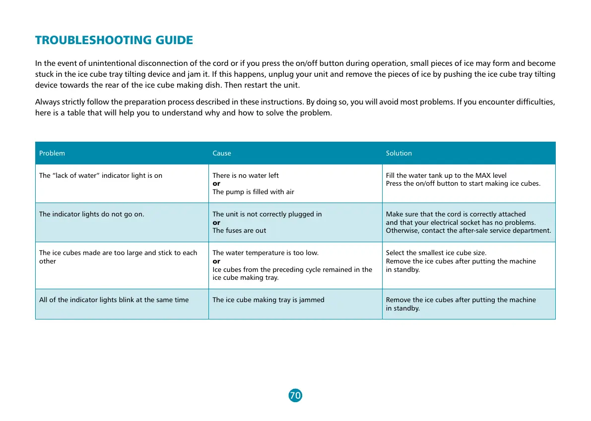 In the event of unintentional disconnection of the cord or if you press the on/off button during operation, small pieces of ice may form and become