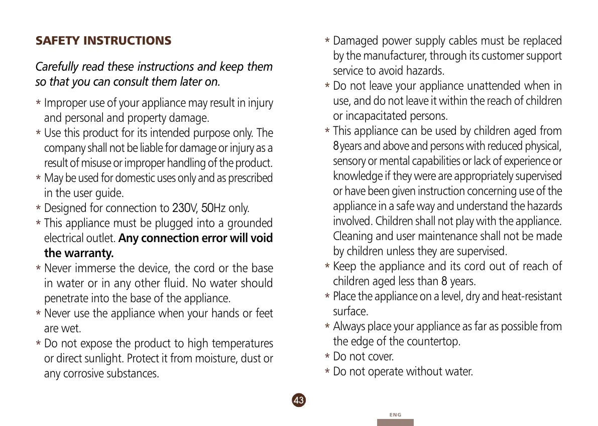 Never immerse the device, the cord or the base