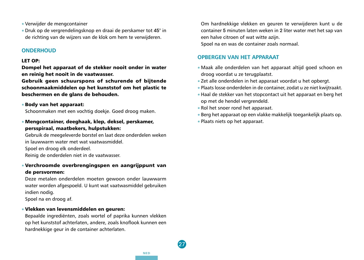 Reinig de onderdelen niet in de vaatwasser.