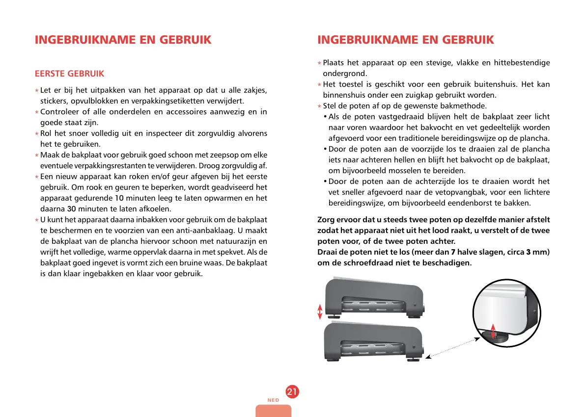 • Door de poten aan de voorzijde los te draaien zal de plancha
