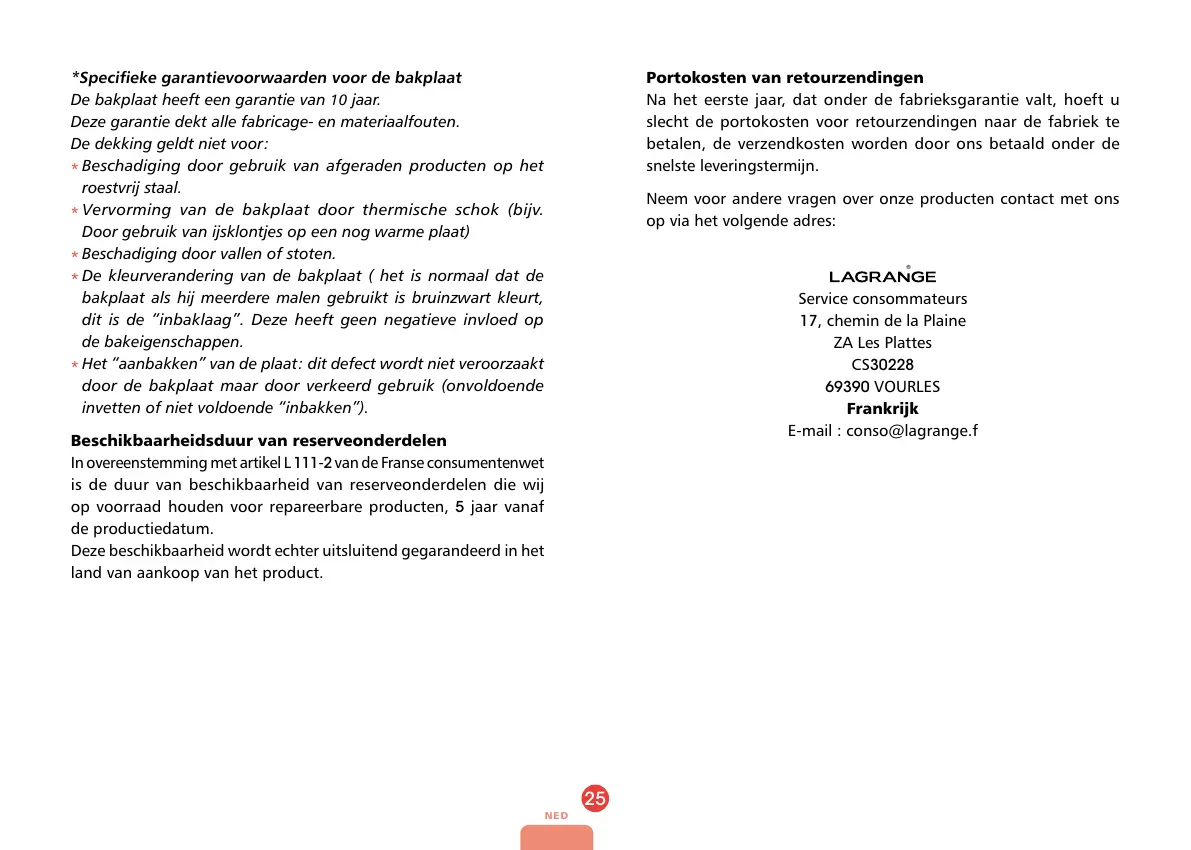 *Specieke garantievoorwaarden voor de bakplaat