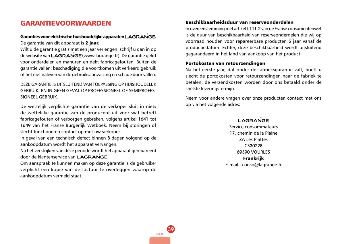 de website van (www.lagrange.fr). De garantie geldt
