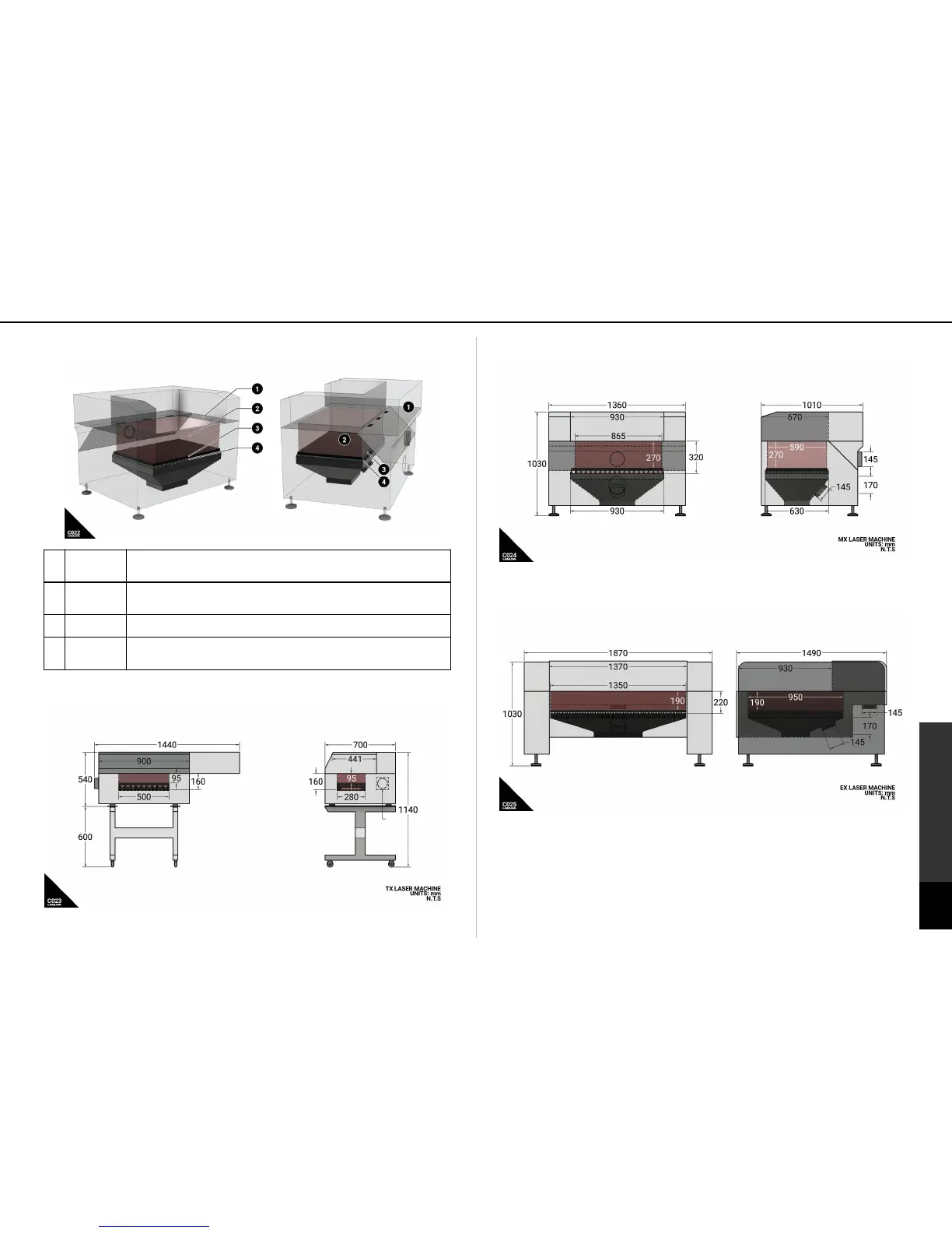 Fig C024: MX Laser machine capacities and dimensional drawing.