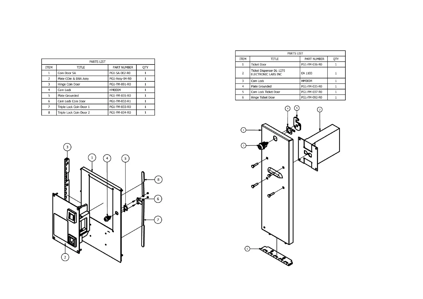LAI Games Let’s Bounce - Coin and Ticket Doors; Coin Door Assembly Parts; Ticket Door Assembly Parts