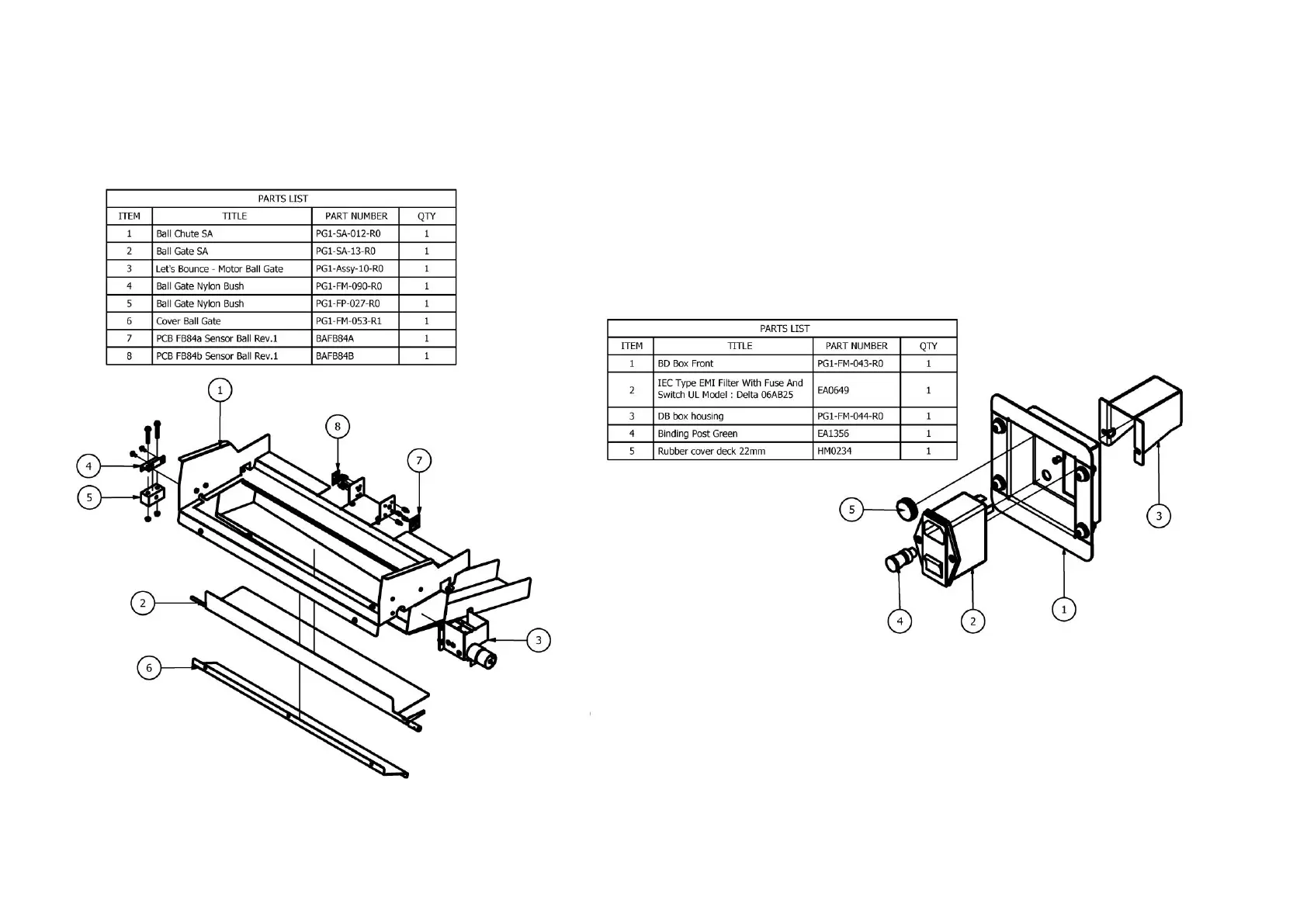 LAI Games Let’s Bounce - Ball Gate and DB Box Components; Ball Gate Assembly Parts; DB Box Assembly Parts