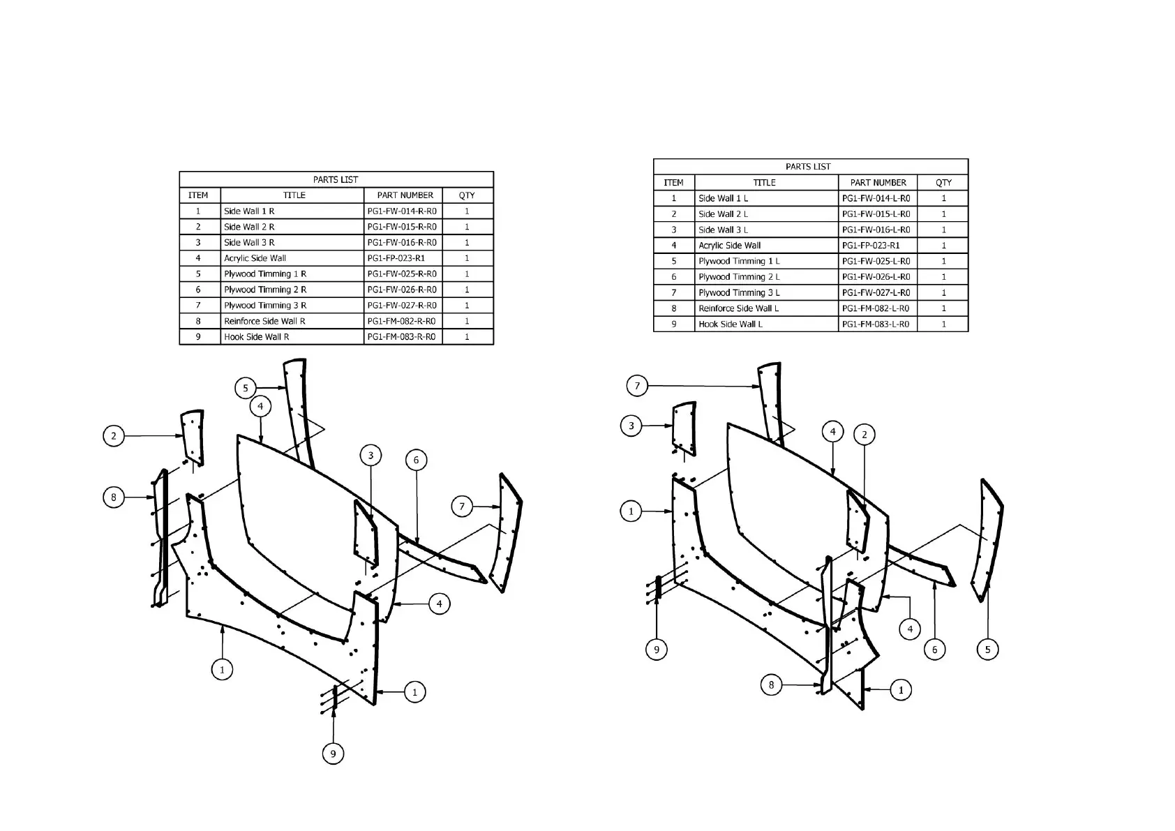 LAI Games Let’s Bounce - Side Wall Components; Right Side Wall Parts List; Left Side Wall Parts List