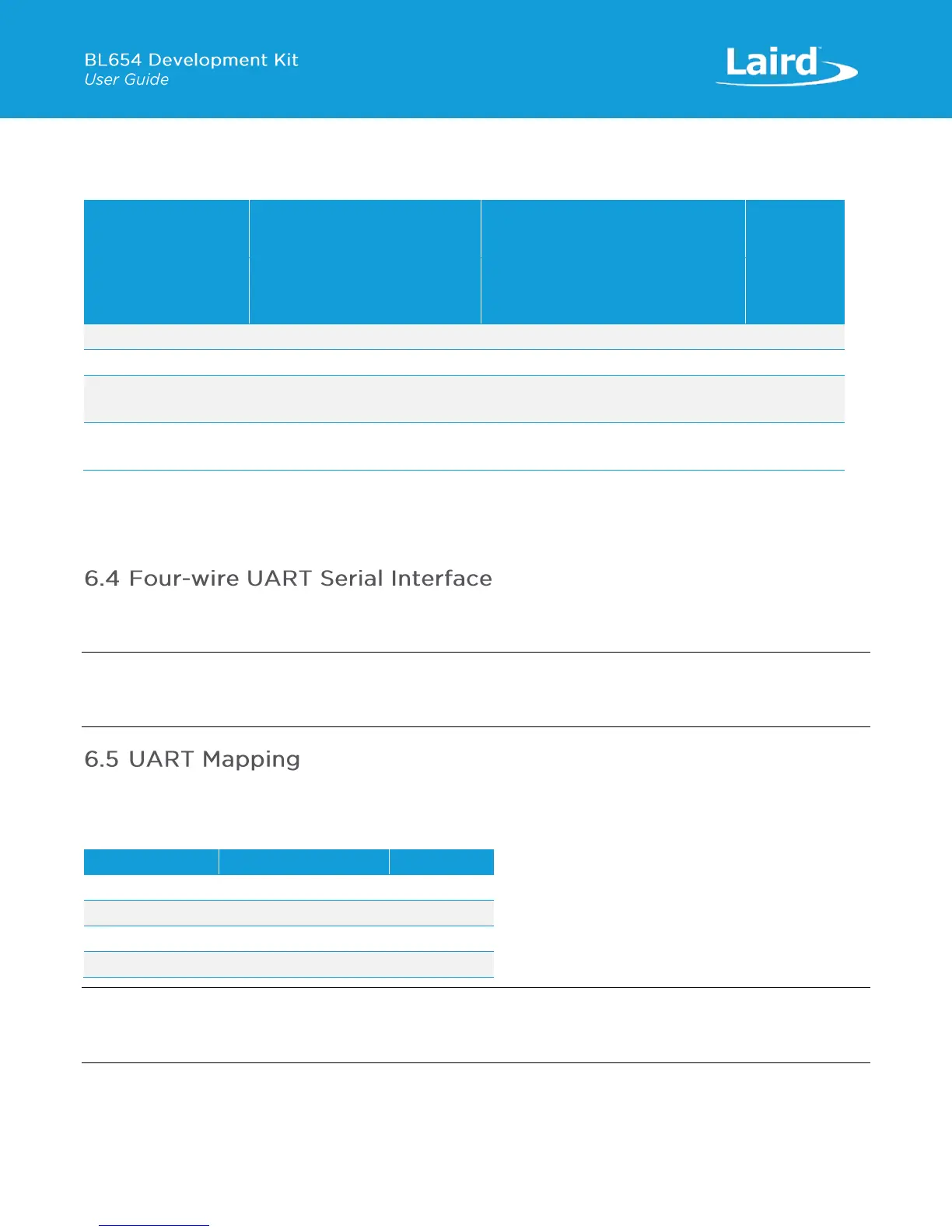 The development board provides access to the BL654 module four-wire UART interface (TX, RX, CTS, RTS) either through