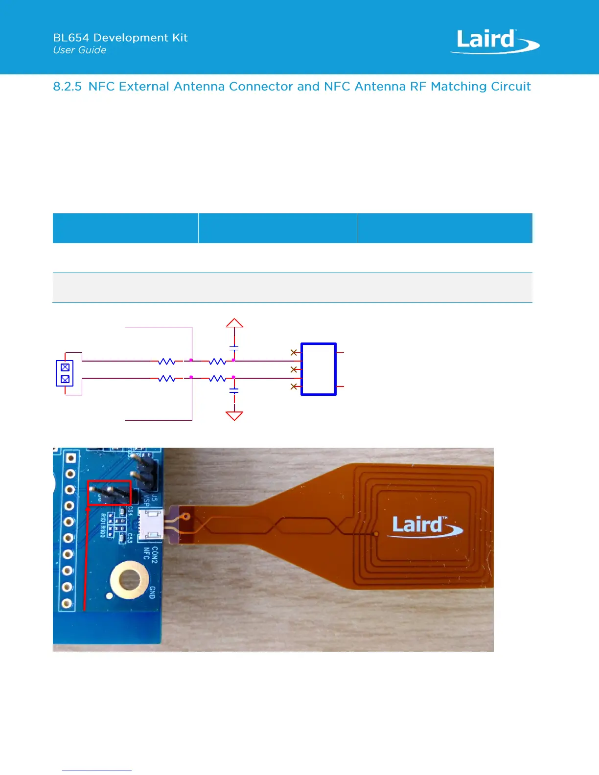 The NFC antenna input connector (CON2) allows the Laird supplied flex-PCB NFC antenna to be plugged in. The BL654
