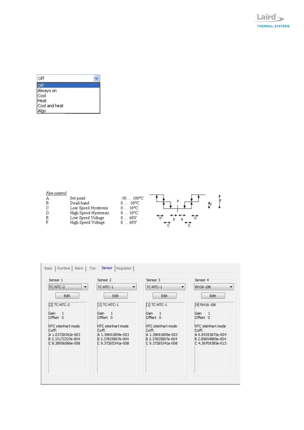 on fans permanently, only in heating mode and/or cooling mode, during specific temperature set