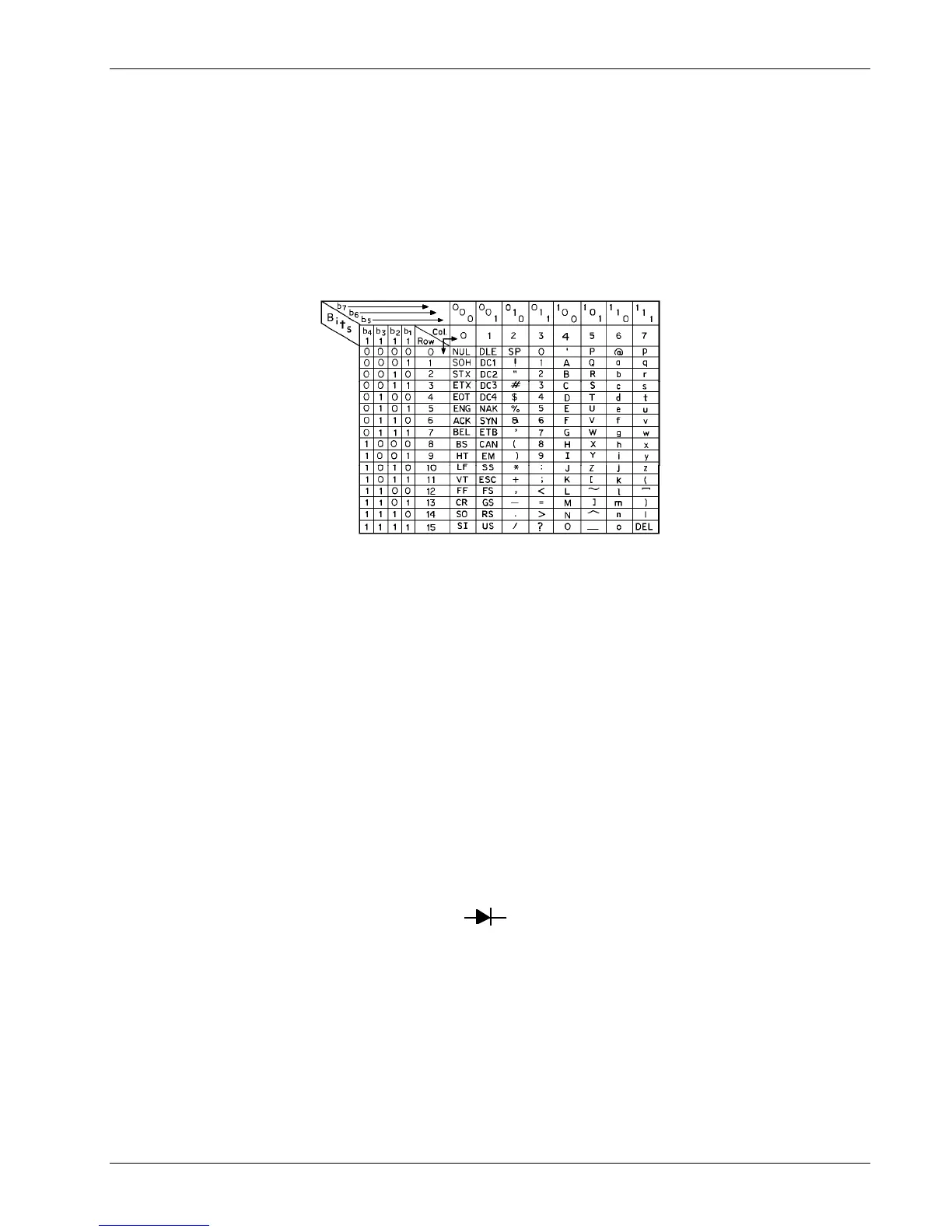 128 numerals, letters, symbols, and special control codes are represented by a 7-bit binary number as follows: