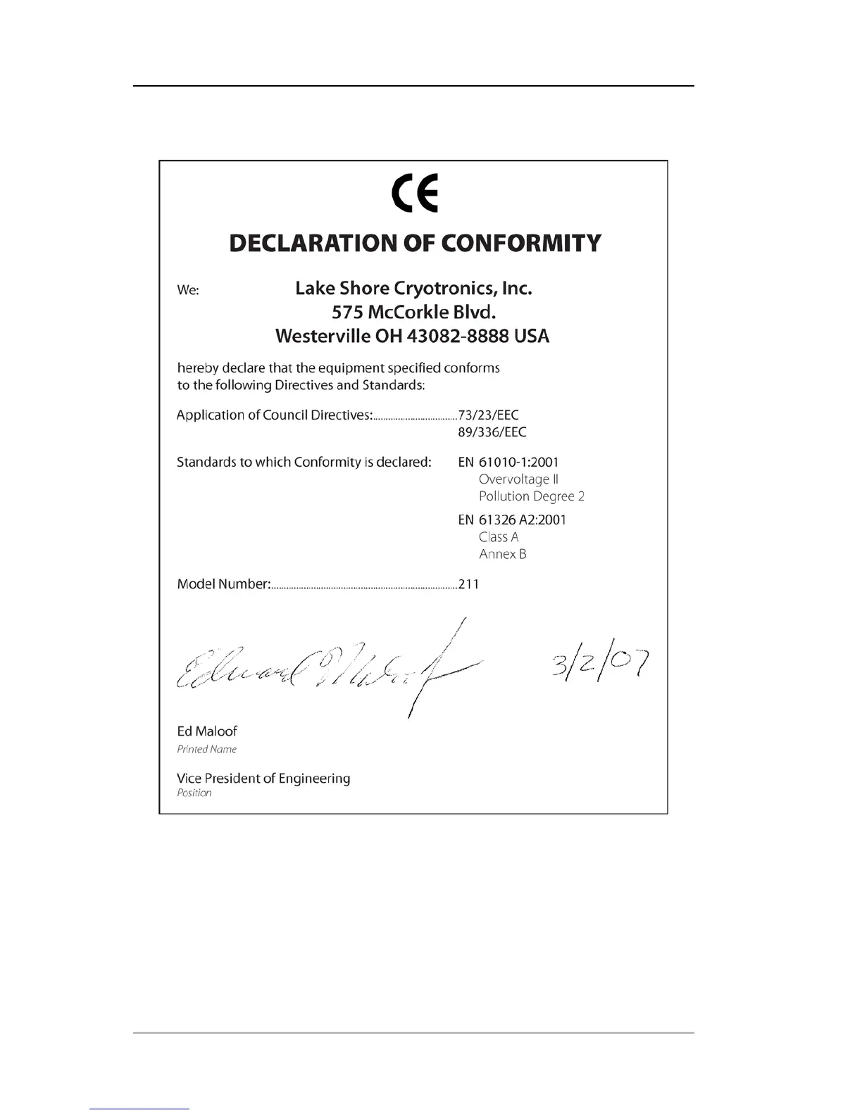 Lakeshore 211 - Model 211 CE Declaration of Conformity