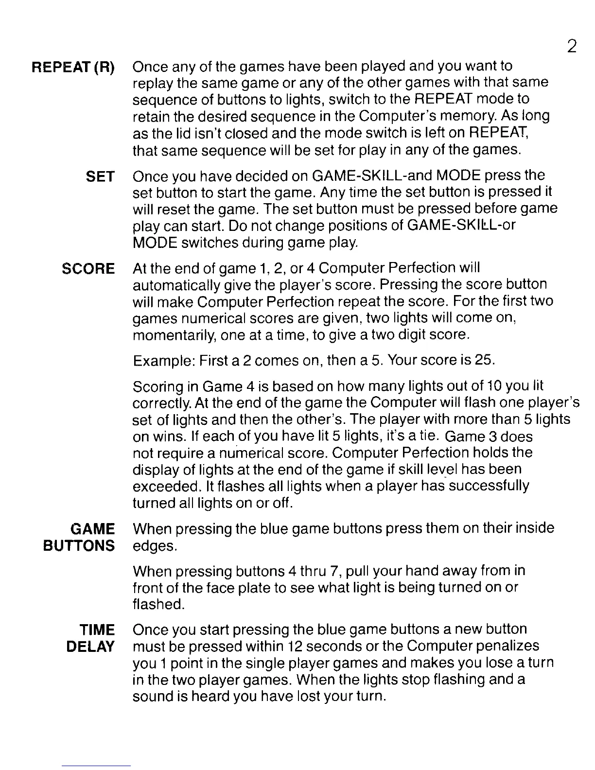 Lakeside Computer Perfection - Repeat (R) Set Score Game Buttons Time Delay