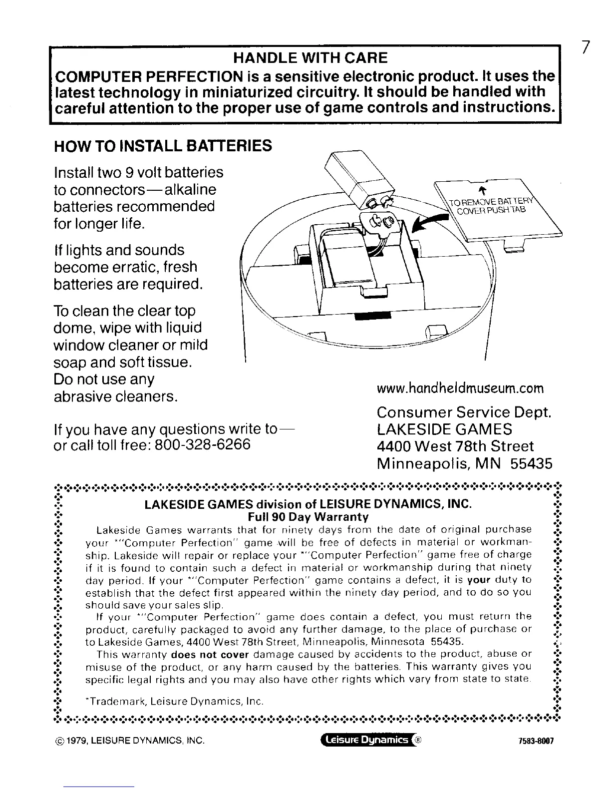 Lakeside Computer Perfection - Handle with Care; How to Install Batteries; Full 90 Day Warranty