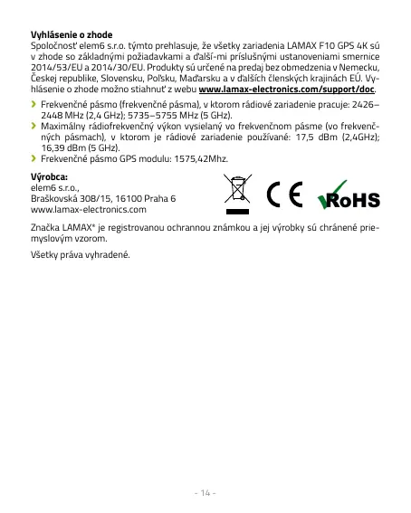 Spoločnosť elem6 s.r.o. týmto prehlasuje, že všetky zariadenia LAMAX F10 GPS 4K sú