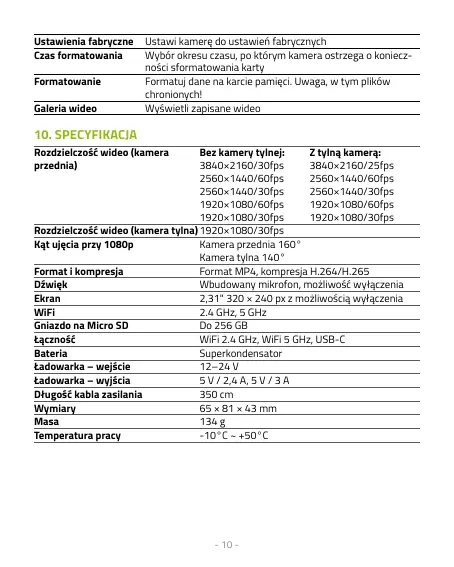 Czas formatowania Wybór okresu czasu, po którym kamera ostrzega o koniecz