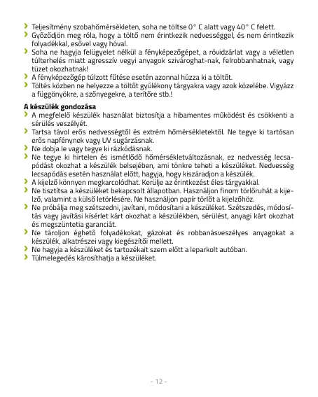 Teljesítmény szobahőmérsékleten, soha ne töltse 0° C alatt vagy 40° C felett.