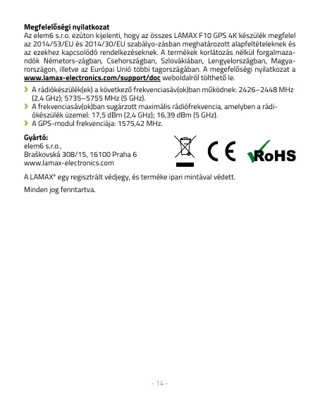 Az elem6 s.r.o. ezúton kijelenti, hogy az összes LAMAX F10 GPS 4K készülék megfelel