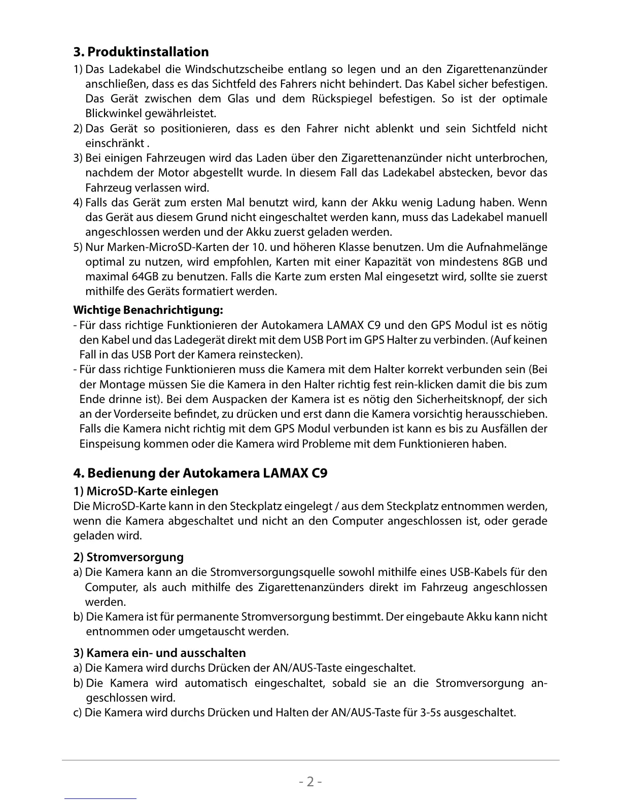 - Für dass richtige Funktionieren der Autokamera LAMAX C9 und den GPS Modul ist es nötig