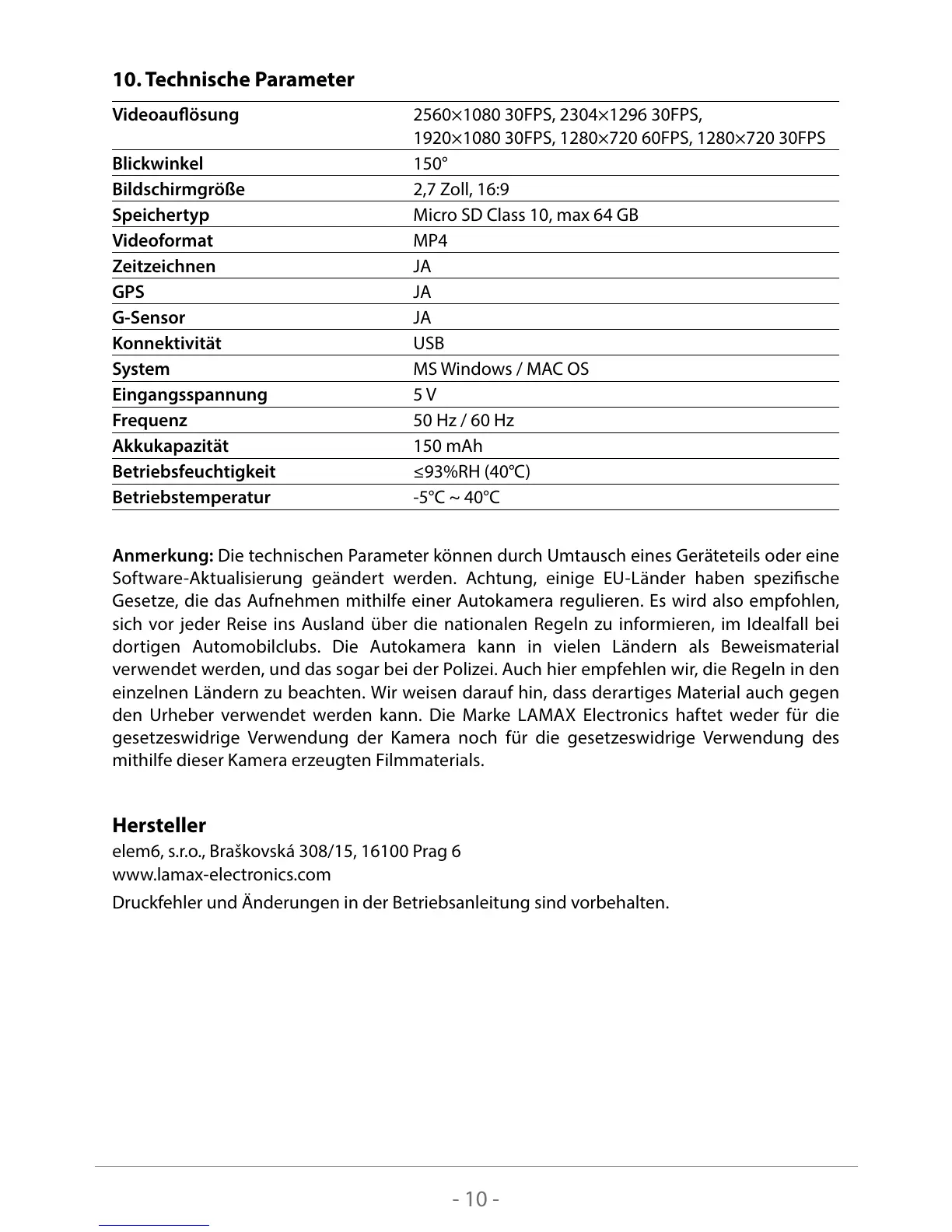 10. Technische Parameter