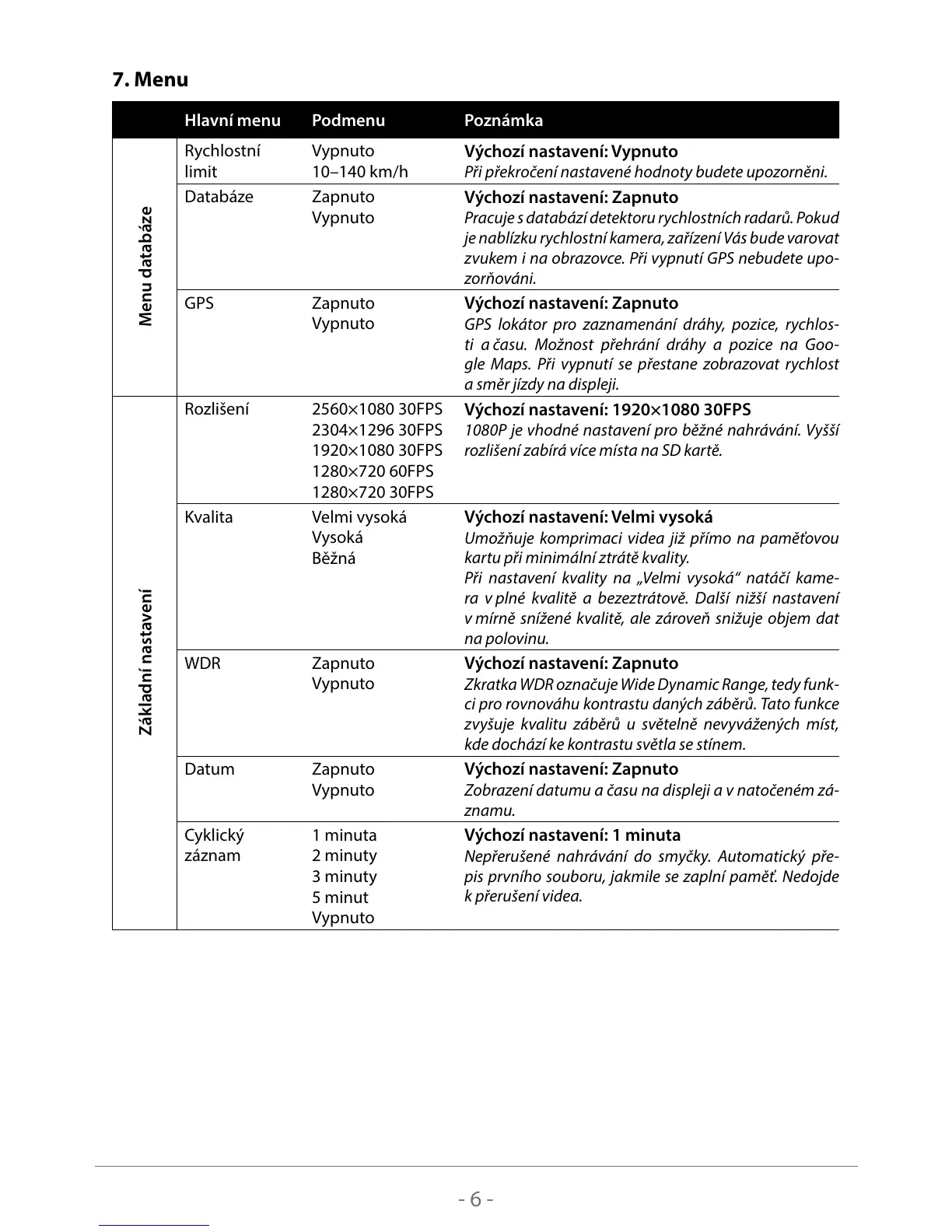 Hlavní menu Podmenu Poznámka