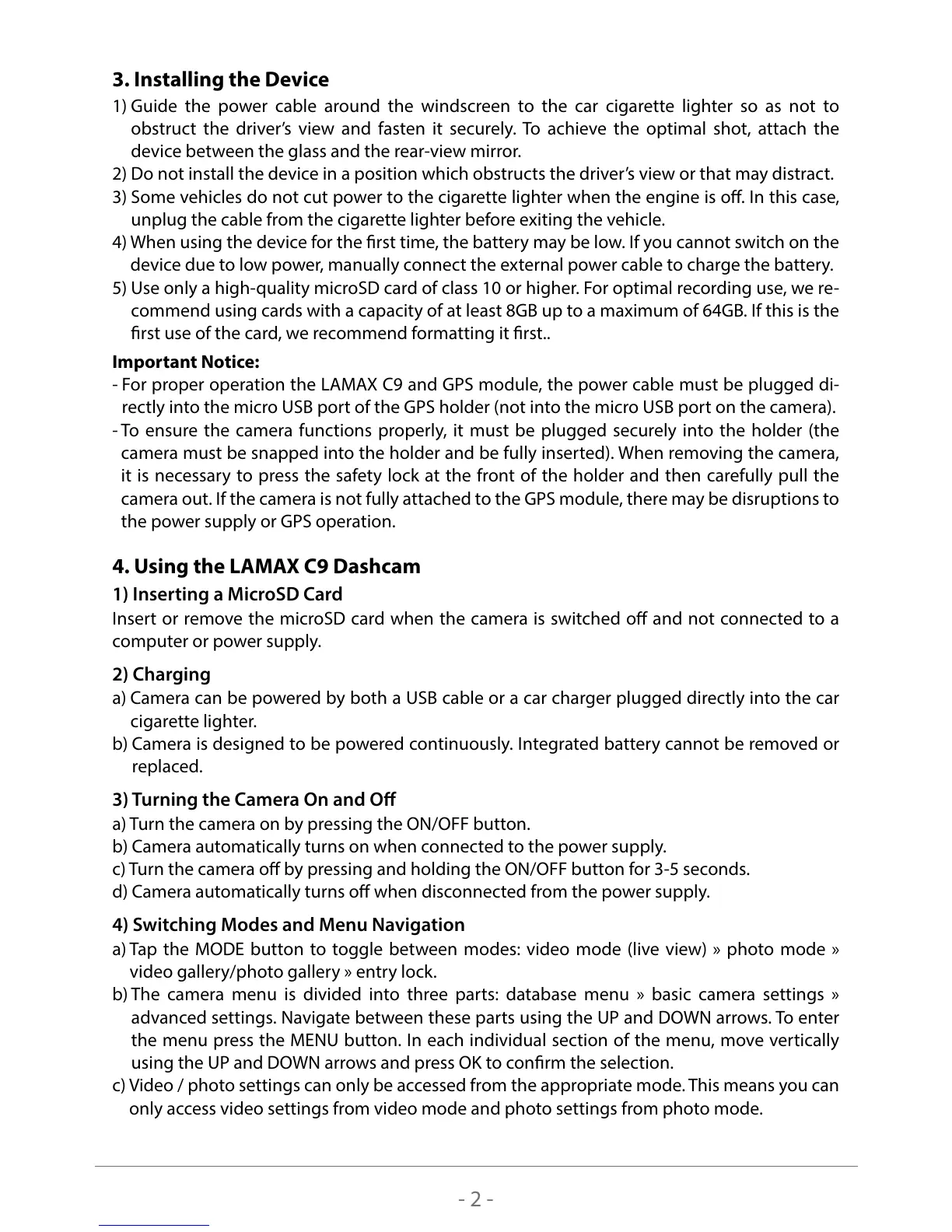 Lamax Electronics LAMAX C9 - Installing the Device; Important Notice