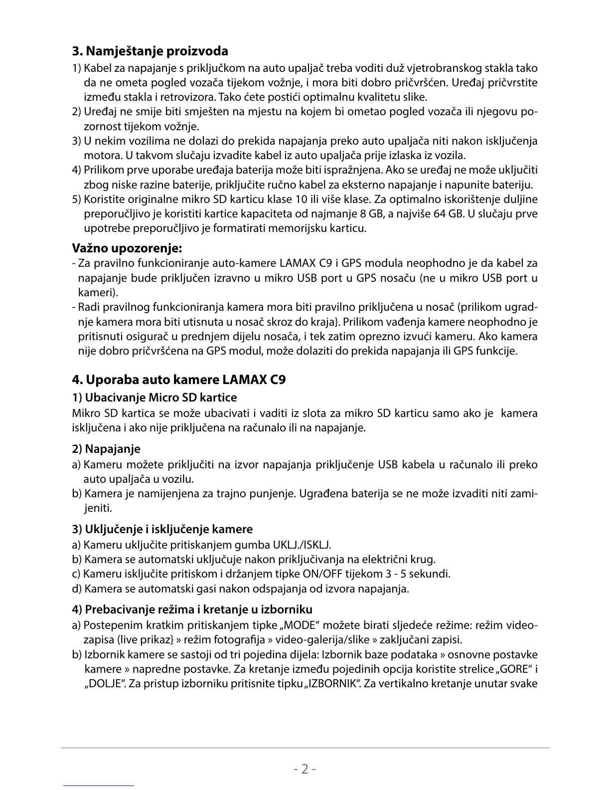 - Za pravilno funkcioniranje auto-kamere LAMAX C9 i GPS modula neophodno je da kabel za