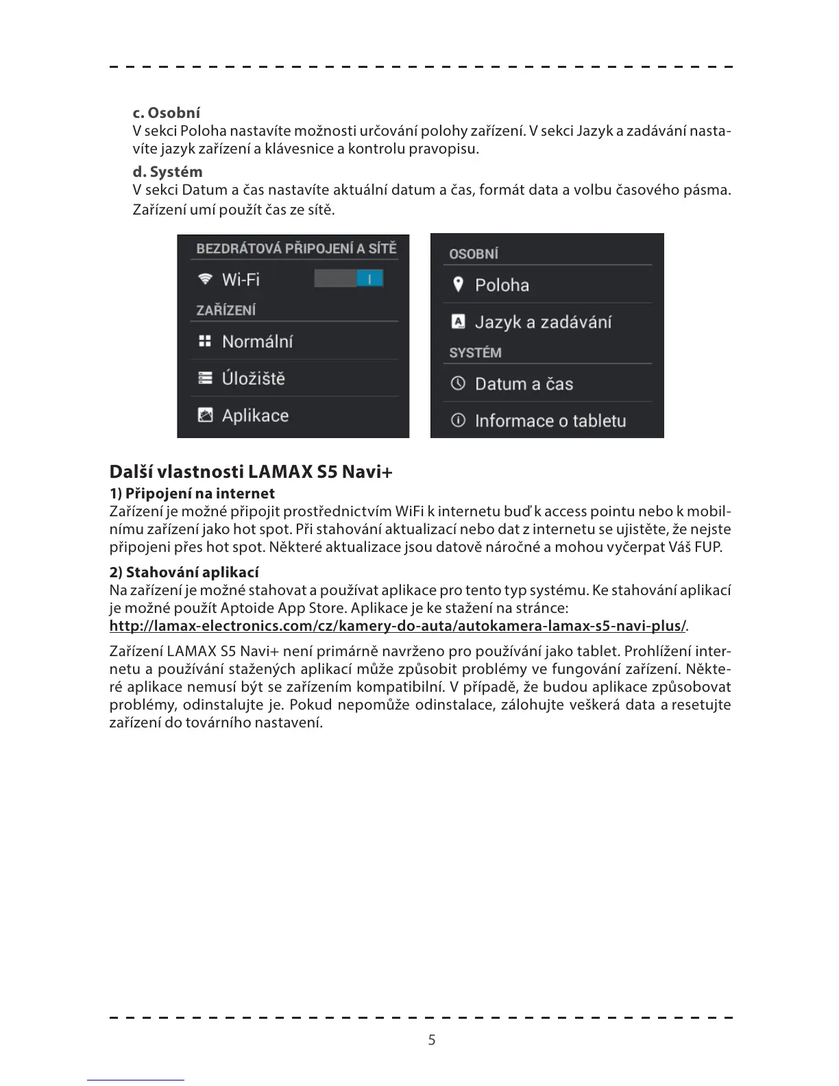 Zařízení LAMAX S5 Navi+ není primárně navrženo pro používání jako tablet. Prohlížení inter-