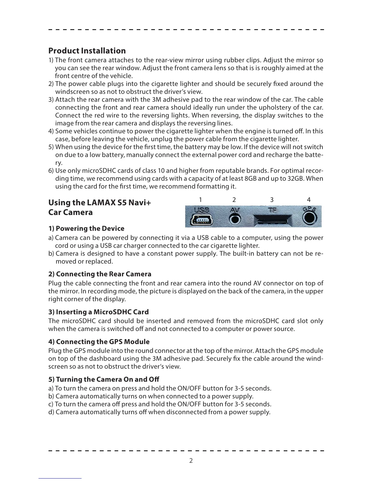 2) The power cable plugs into the cigarette lighter and should be securely xed around the