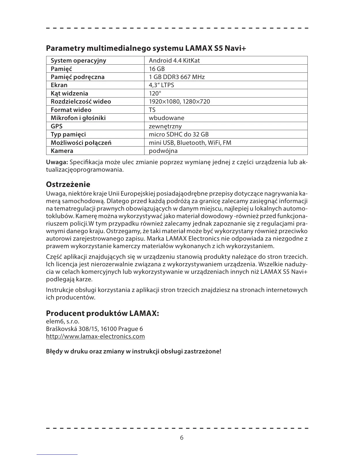 cia w celach komercyjnych lub wykorzystywanie w urządzeniach innych niż LAMAX S5 Navi+