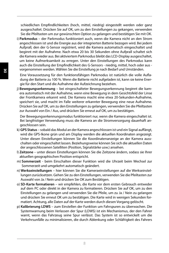 p) Kalibrierung LDWS – zum Einstellen der Funktion um Fahrspuren zu überwachen. Die