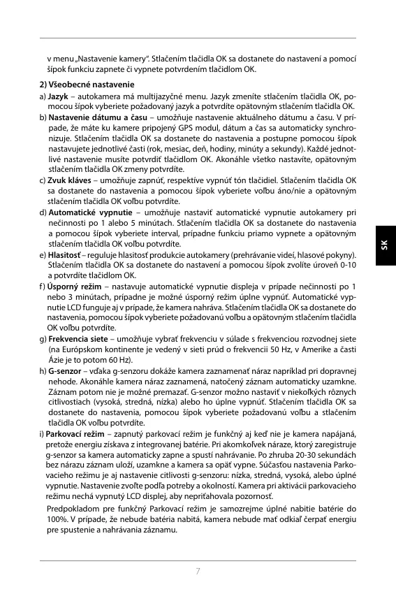 a) Jazyk – autokamera má multijazyčné menu. Jazyk zmeníte stlačením tlačidla OK, po-