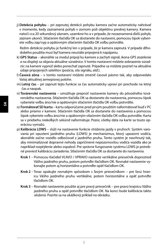 p) Kalibrácia LDWS – slúži na nastavenie funkcie stráženia jazdy v pruhoch. Systém varo