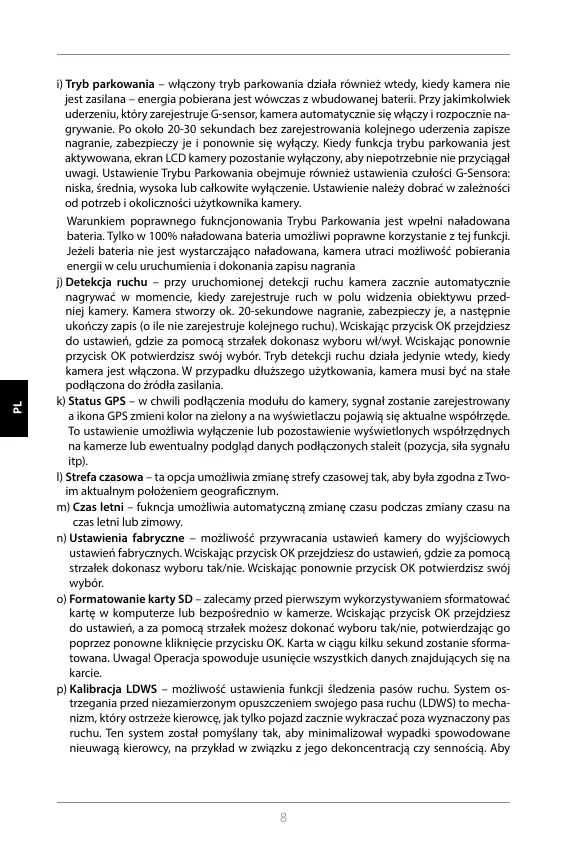 i) Tryb parkowania – włączony tryb parkowania działa również wtedy, kiedy kamera nie