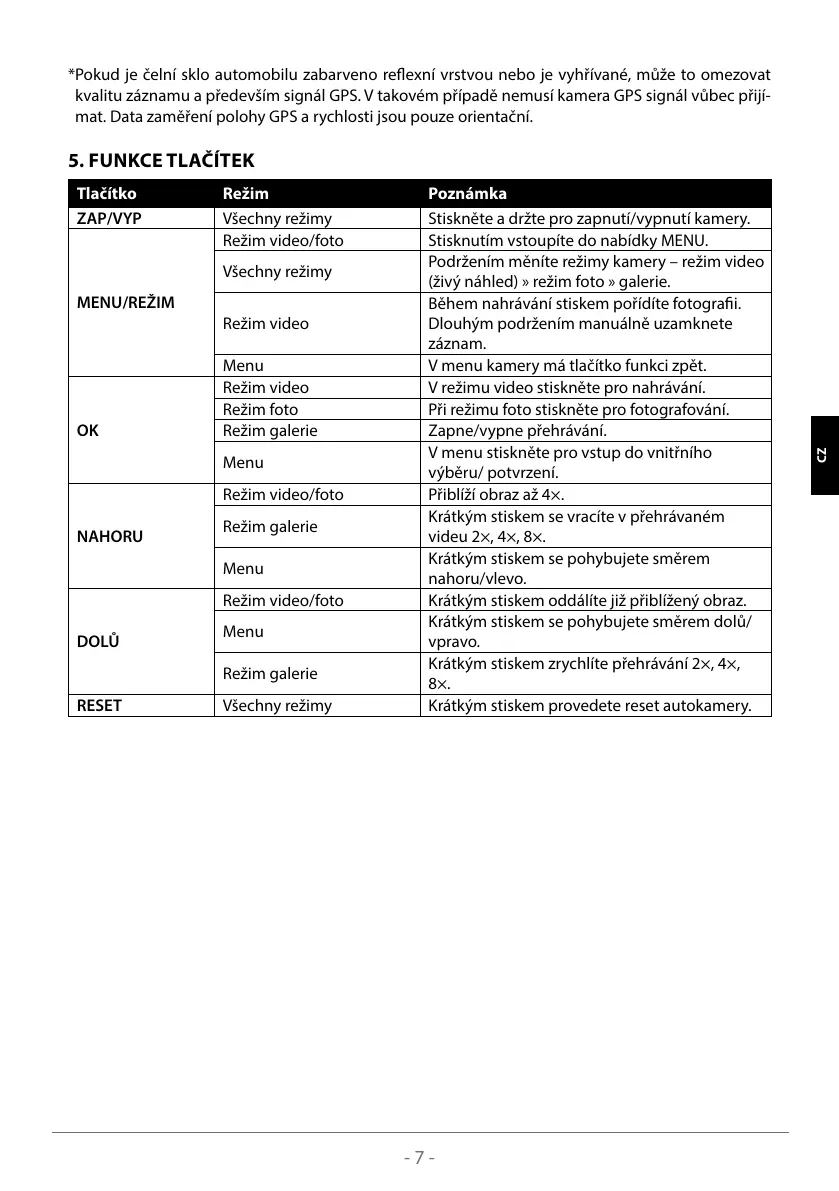 RESET Všechny režimy Krátkým stiskem provedete reset autokamery.