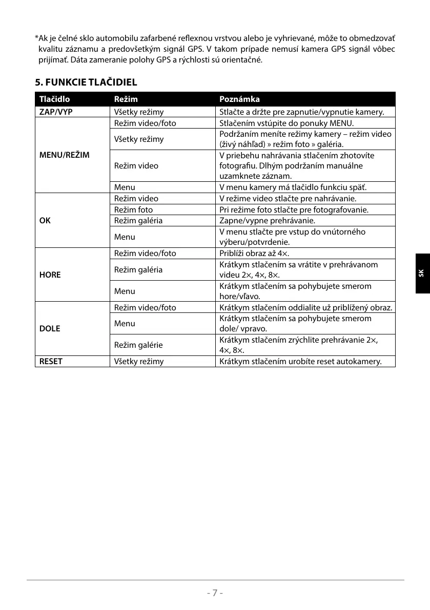 RESET Všetky režimy Krátkym stlačením urobíte reset autokamery.